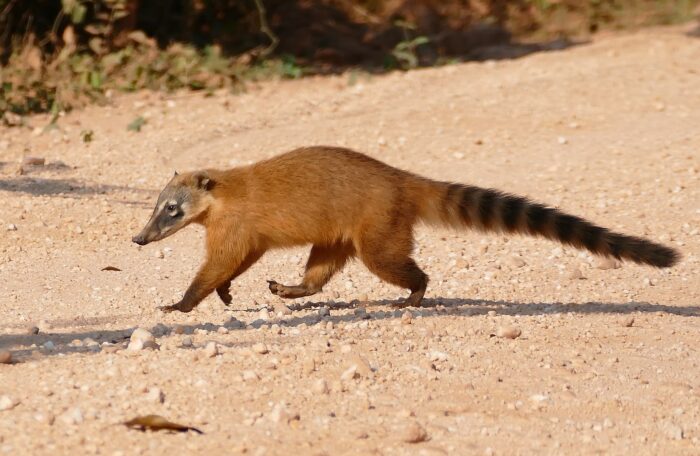 South American Coati (Nasua nausa) female crossing the road. Photo: Bernard Dupont under CC BY-SA 2.0